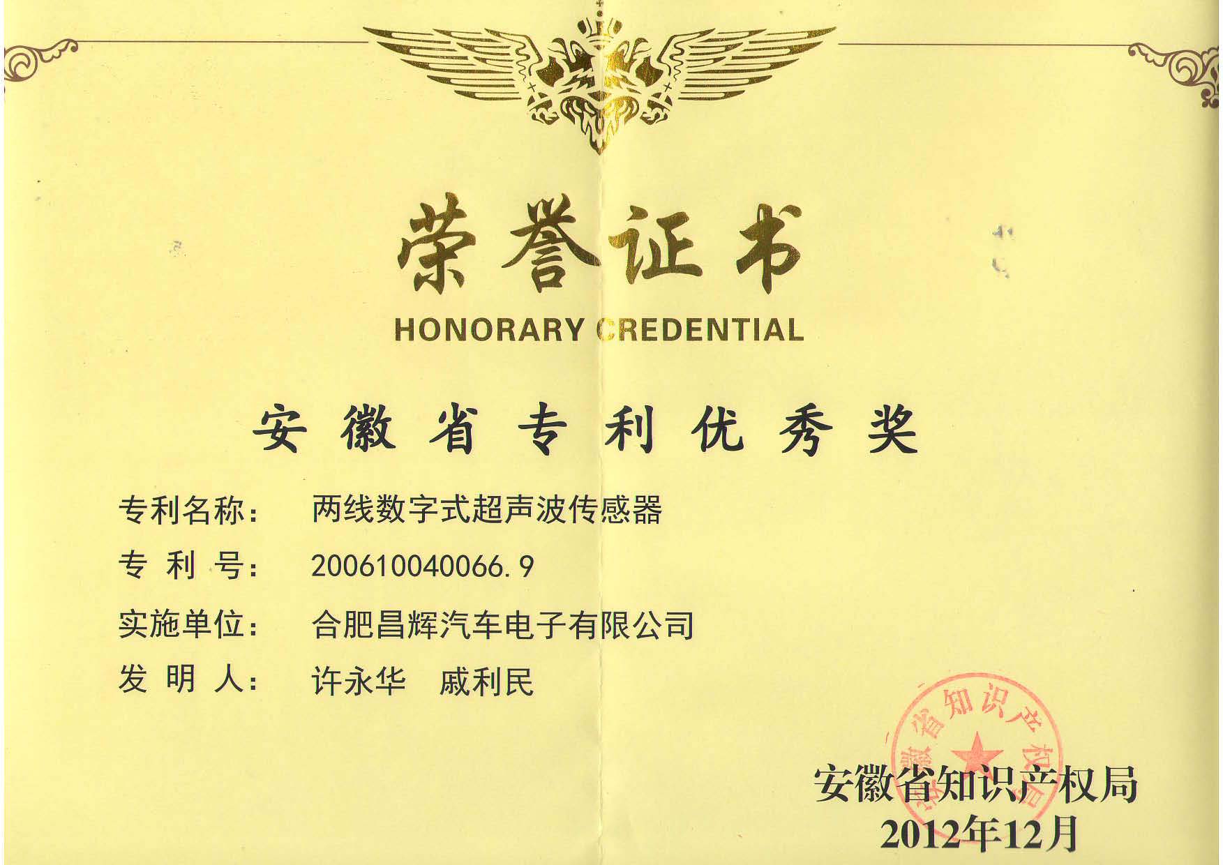 2012年12月 安徽省專利優(yōu)秀獎(jiǎng)